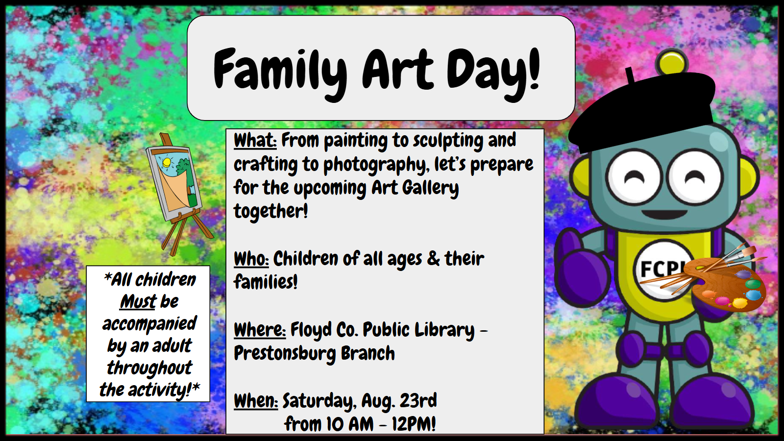 As we prepare for our upcoming Art Gallery later this fall, join us for some family art fun, where you’ll have the chance to take your creativity for a spin! A variety of art stations will be set up where you can create your own masterpieces to be put on display in our art gallery, from sculpting to painting and more! Artwork can be submitted for the art gallery by any and all ages!