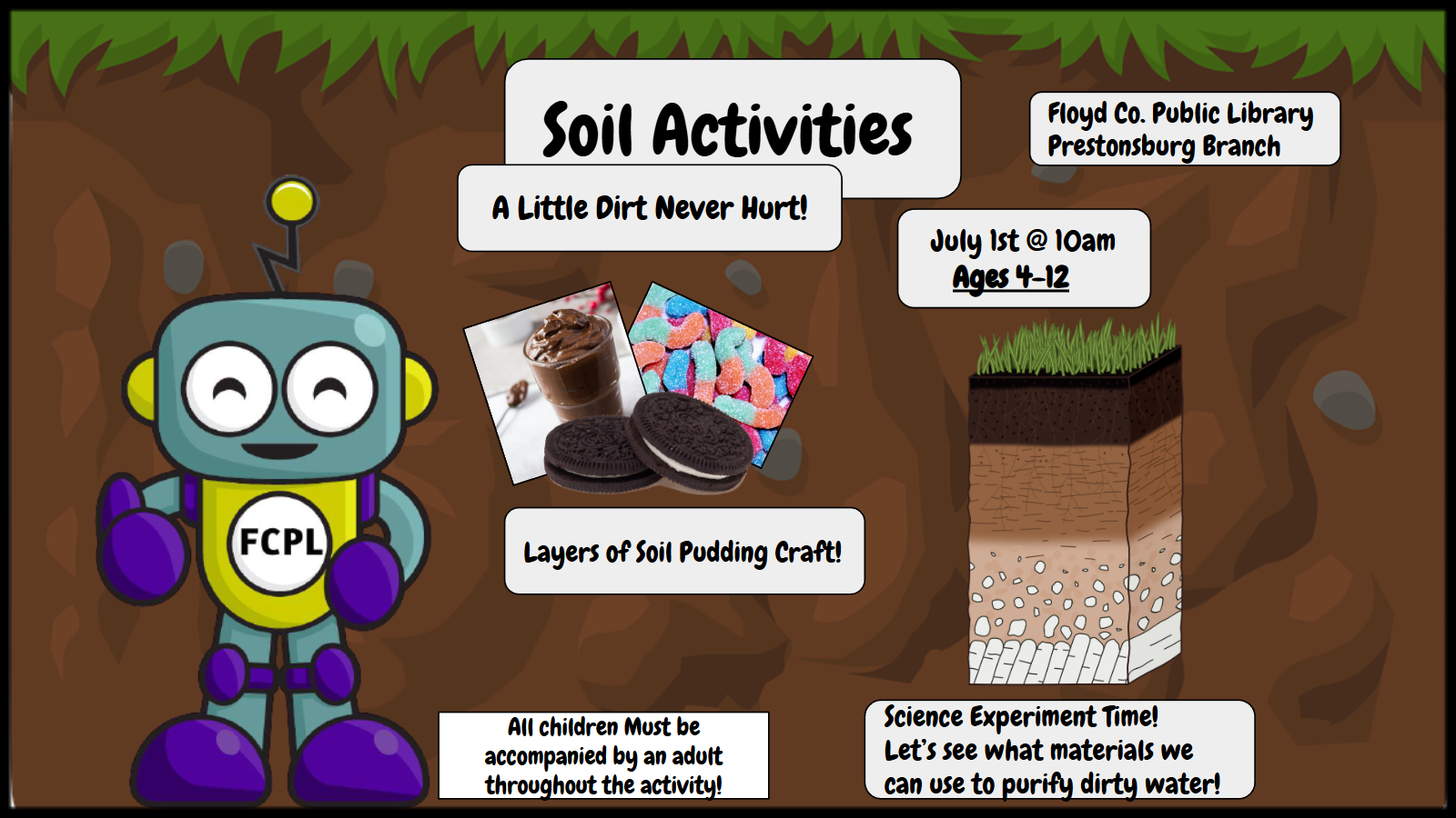 Since a little dirt never hurt, let’s dive into a couple soil activities! Let’s see what materials we can use to purify dirty water! Then, we’ll learn about the different layers of soil with a chocolate pudding craft!